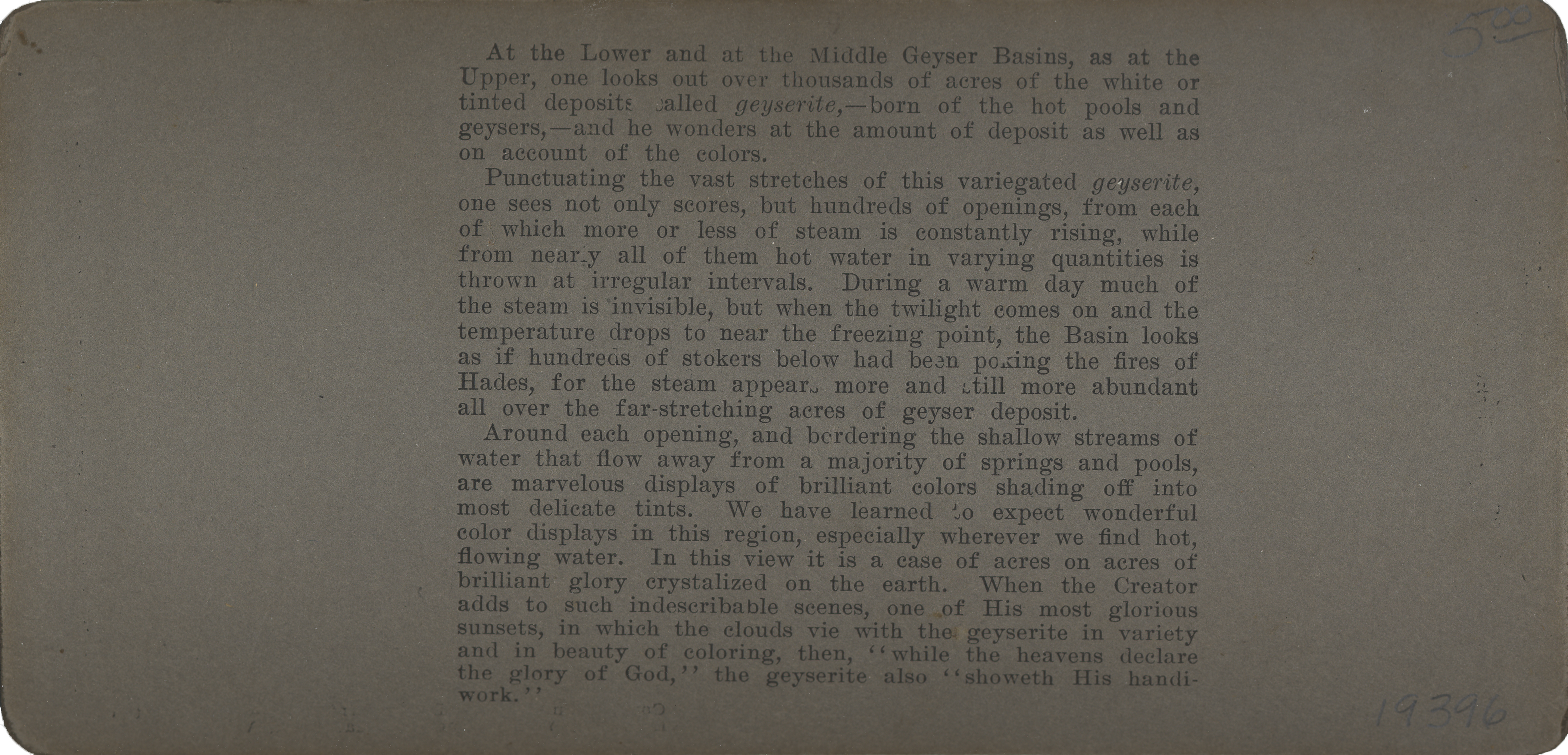 At the Lower and at the Middle Geyser Basins, as at the Upper, one looks out over thousands of acres of the white or tinted deposits called geyserite,--born of the hot pools and geysers,--and he wonders at the amount of deposit as well as on account of the colors.  Punctuating the vast stretches of this variegated geyserite, one sees not only scores, but hundres of openings, from each of which more or less of steam is constantly rising, while from nearly all of them hot water in varying quantities is thrown at irregular intervals. During a warm day much of the steam is invisible, but when the twilight comes on and the temperature drops to near the freezing point, the Basin looks as if hundres of stokers below had been poking the fires of Hades, for the steam appears more and still more abundant all over the far-stretching acres of geyser deposit.  Around each opening, and bordering the shallow streams of water that flow away from a majority of springs and pools, are marvelous displays of brilliant colors shading off into most delicate tints. We have learned to expect wonderful color displays in this region, especially wherever we find hot, flowing water. In this view it is a case of acres on acres of brilliant glory crystalized on the earth. When the Creator adds to such indescribable scenes, one of His most glorious sunsets, in which the clouds vie with the geyserite in variety and in beauty of coloring, then "white the heavens declare the glory of God," the geyserite also "showeth His handiwork."