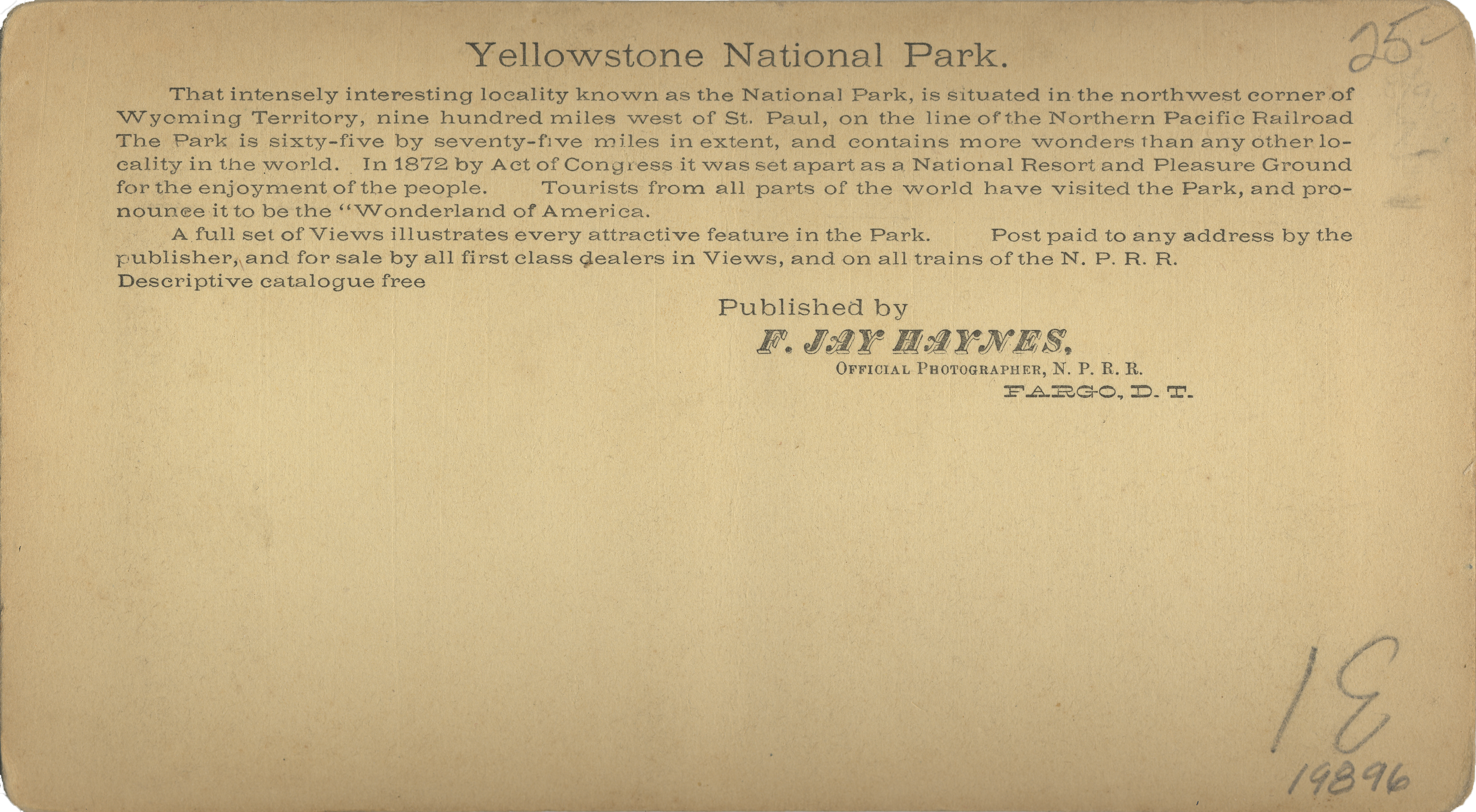 YELLOWSTONE NATIONAL PARK. That intensely interesting locality known as the National Park is situated in the northwest corner of Wyoming Territory, nine hundred miles west of St. Paul, on the line of the Northern Pacific Railroad. The Park is sixty-five by seventy-five miles in extent, and contains more wonders than any other locality in the world. In 1872 by Act of Congress it was set apart as a National resort and Pleasure Ground for the enjoyment of the people. Tourists from all parts of the world have visited the Park, and pronounce it to be the "Wonderland of America." A full set of Views illustrated every attractive feature in the Park. Post paid to any address by the publisher, and for sale by all first-class dealers in Views, and on all trains of the N. P. R. R. Descriptive catalogue free.